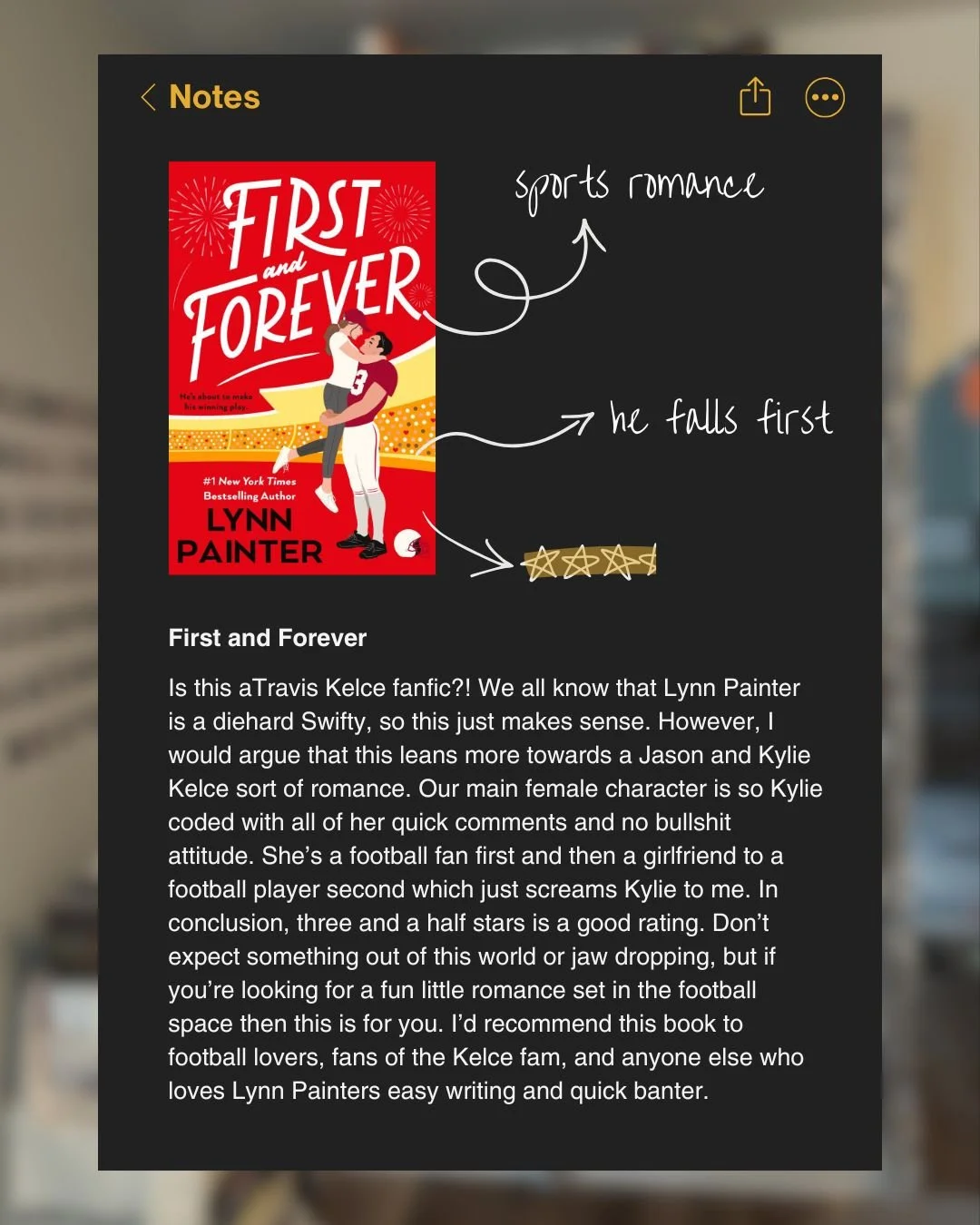 Reading First and Forever, all I kept thinking about was how this book is probably going to be compared a lot to some sort of Travis Kelce fanfic romance. Our main male character is a tight end, a bit of a silly goose, and a massive giant which is very in line with a Travis Kelce personality. We all know that Lynn Painter is a diehard Swifty, so this just makes sense. However, all that being said, I would argue that this leans more towards a Jason and Kylie Kelce sort of romance if you can ignore the fact that Jason was a center unlike his tightened little brother. Our main female character is so Kylie coded with all of her quick comments and no bullshit attitude. She’s a football fan first and then a girlfriend to a football player second which just screams Kylie to me. But I may be biased because I’m 100% more a Kylie fan than a Taylor fan.